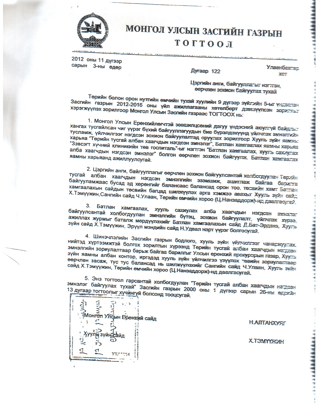 Монгол улсын Засгийн газар өнгөрөгч сарын 3-ны өдрийн хуралдаанаараа 122 тоот тогтоолыг гаргаж Төрийн тусгай албан хаагчдын эмнэлгийг Цэргийн госпитальд нэгтгэн, шинээр баригдаж буй барилгыг Хууль зүйн яаманд албан тасалгаа болгохоор шийдвэрлэсэн.