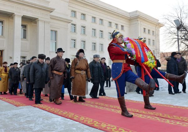 Цэцэг өргөхөд үлээвэр найрал хөгжимд Төрийн дуулал эгшиглэж, хүндэт харуул жагслаа.
