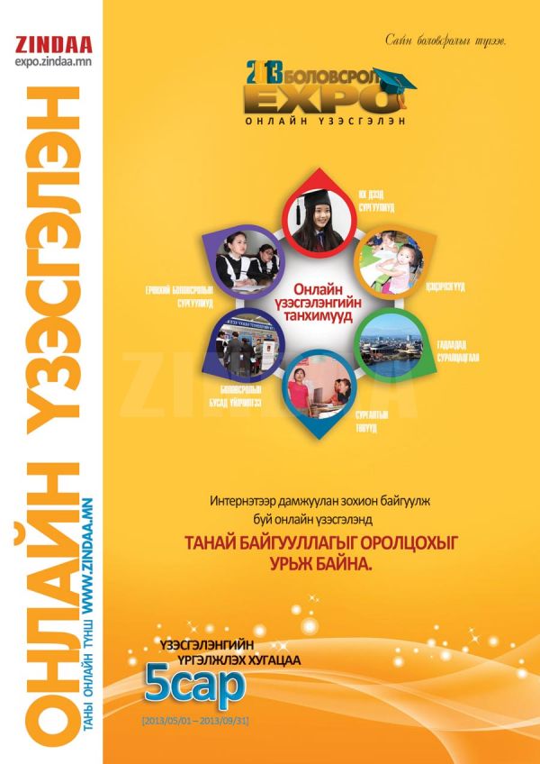 -Баярлалаа, юуны өмнө уншигчиддаа энэ өдрийн мэндийг хүргэе. Манай www.Zindaa.mn сайтын шинэ салбар сайт болох expo.zindaa.mn сайт нээлтээ хийгээд удаагүй байна. Энэ салбар сайт бол онлайн үзэсгэлэн зохион байгуулдаг сайт бөгөөд бид сайтын нээлтэндээ зориулж “Боловсрол-2013” нэртэй боловсролын онлайн үзэсгэлэн зохион байгуулж байгаа юм.