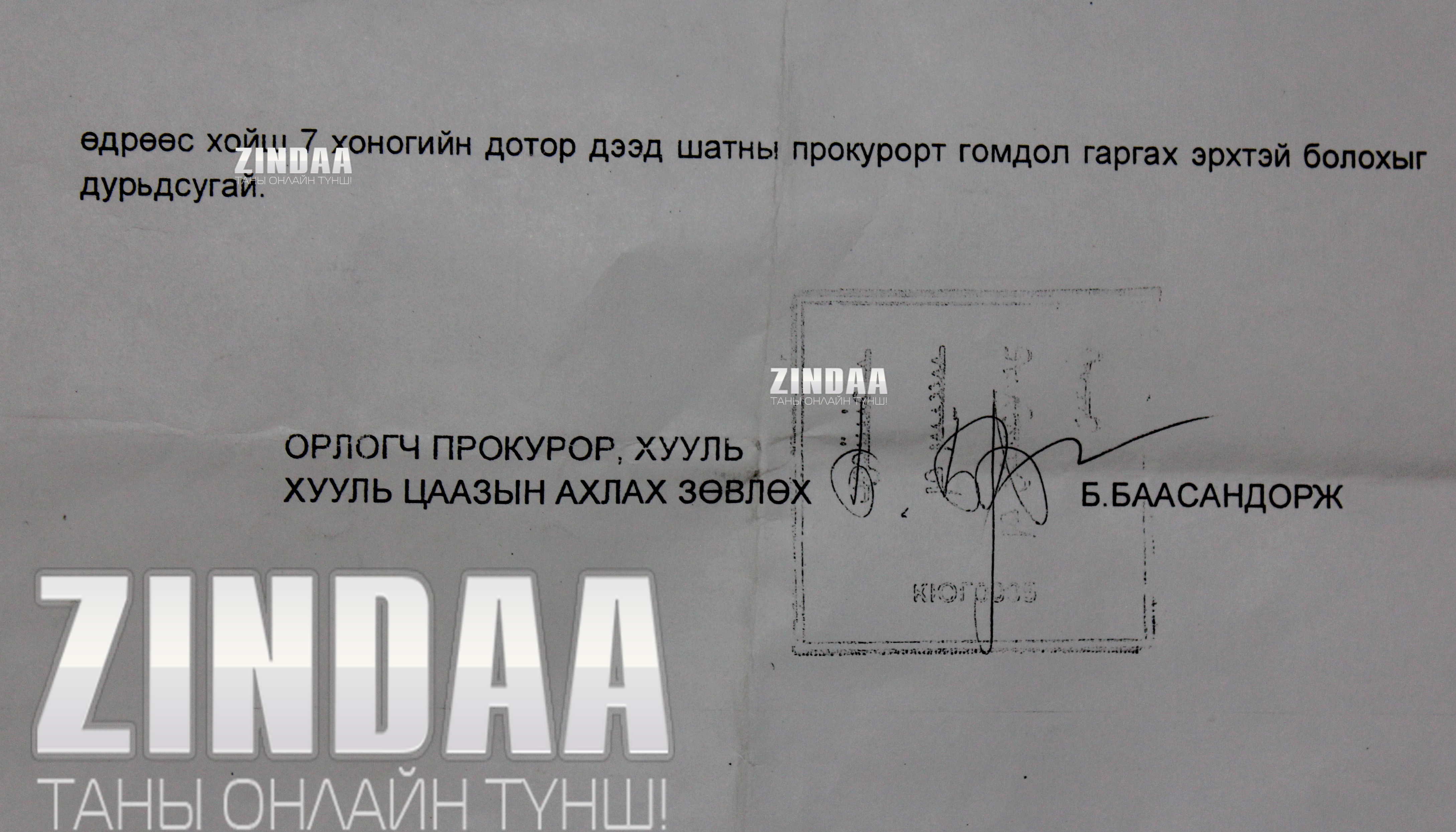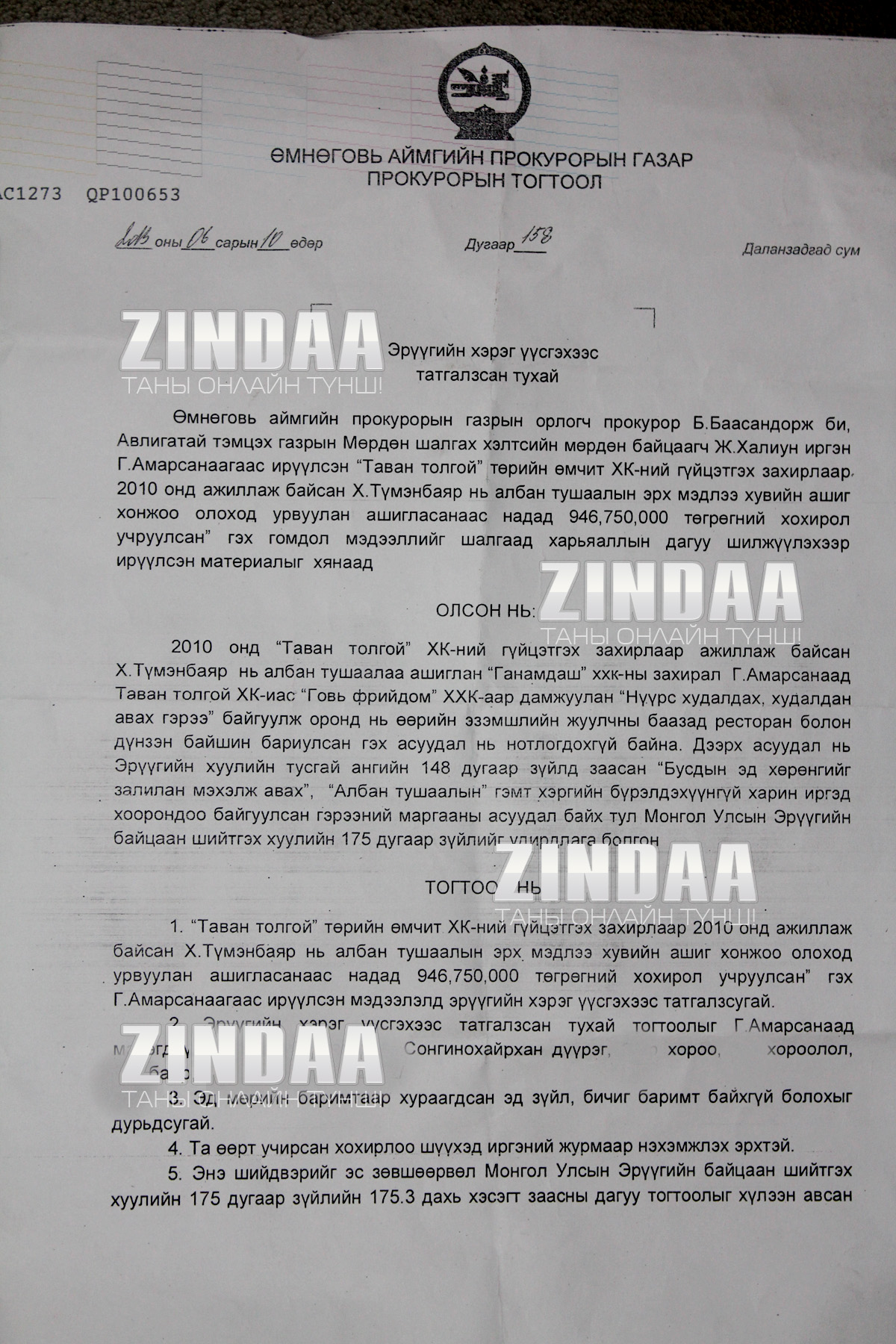 Харин Улсын прокурор нь “Энэ бол гэмт хэрэг биш. Эрүүгийн хэрэг биш” гэсэн даалгаварыг Өмнөговь аймгийн прокурорт өгсөн бололтой. Ямартай ч ужиг явцтай байсан хэргийн тухай тогтоол Өмнөговь аймгийн прокуророос иржээ.