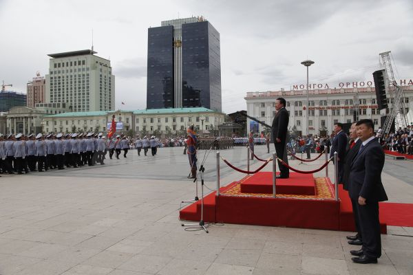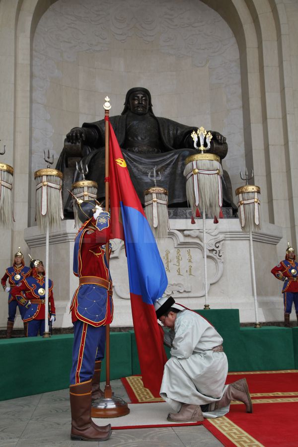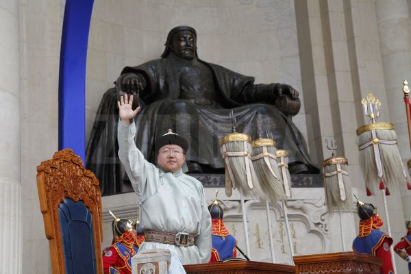Монгол Улсын Ерөнхийлөгчийн 2013 оны сонгуулиар Төрийн тэргүүнээр дахин сонгогдсон Цахиагийн Элбэгдорж өнөөдөр 11.40 цагаас буюу морин цагт Ерөнхийлөгчийн тангараг өргөлөө. Энэ удаагийн Ерөнхийлөгчийн тангараг өргөх ёслол анх удаа Чингис хааны хөшөөний өмнө, ард иргэдийнхээ өмнө болсноороо онцлог юм. Тангараг өргөх ёслолын өмнө Төрийн есөн хөлт цагаан туг, төрийн тамга, Үндсэн хуулийн уг эх зэргийг Төрийн ордноос залан гаргаж ирлээ.