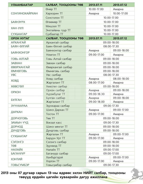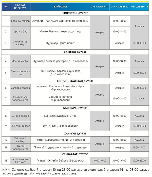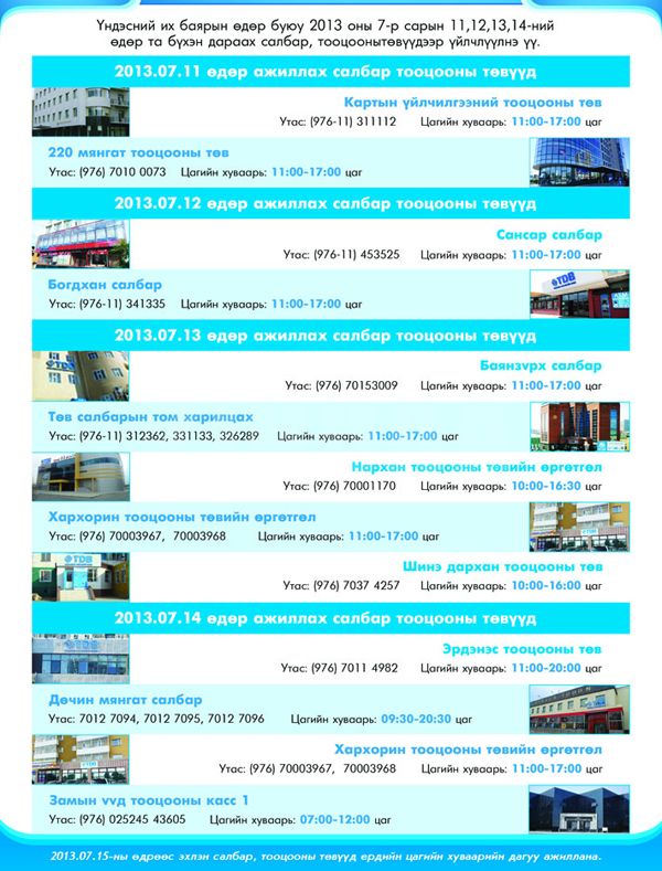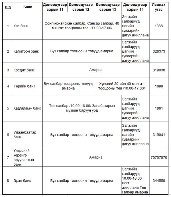 Баярын өдрүүд буюу долоодугаар сарын 11-13-нд ихэнх банкууд амрах бол 14-нөөс энгийн цагийн хуваарийн дагуу ээлжийн салбарууд ажиллах юм байна.Банкуудын ажиллах цагийн тодорхой хуваарьтай танилцана уу.