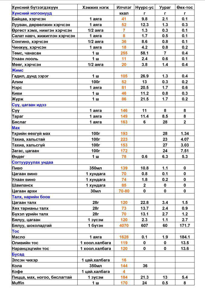 Тэгвэл бид ямар хүнснээс хэр хэмжээний илчлэг авдаг болохоо дараах хүснэгтээс харж болох юм.