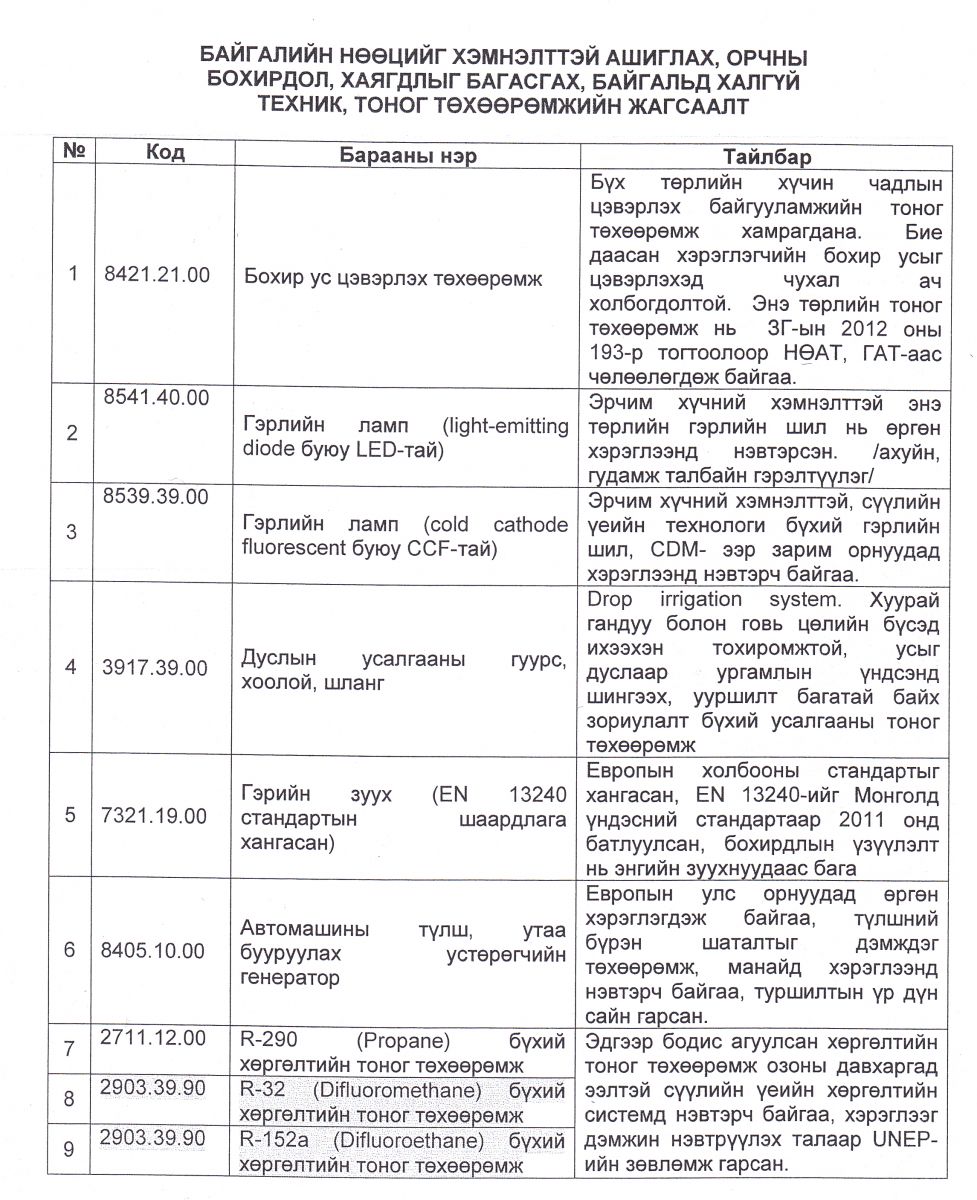 Байгалийн нөөцийг хэмнэлттэй ашиглах, орчны бохирдол, хаягдлыг багасгах, байгальд халгүй техник, тоног төхөөрөмжийн жагсаалтыг Засгийн газрын  хуралдаанаар батлаад байна. Улмаар хэрэгжилтэд нь хяналт тавьж ажиллахыг Сангийн сайд Ч.Улаан, Байгаль орчин, ногоон хөгжлийн сайд С.Оюун нарт даалгав. Жагсаалтад нийт 41 нэр төрлийн техник, тоног төхөөрөмж багтсан байна. Тэгэхээр үнэхээр байгальд халгүй техник, тоног төхөөрөмжүүд мөн үү гэдгийг цаг хугацаа харуулах биз. Ямартай ч дэлхийн улс орнуудын хөгжлийн чиг хандлага нь нөөцийн үр ашигтай, зохистой хэрэглээг дэмжин, байгаль орчны бохирдол, доройтлоос урьдчилан сэргийлсэн, хүлэмжийн хийн ялгаварлал багатай ногоон хөгжлийн тогтолцоог бий болгоход чиглэгдэж буй энэ үед  ийм жагсаалт батлах нь ногоон хөгжлийг хангахад чухал алхам болно гэж үзэж байгаа аж.