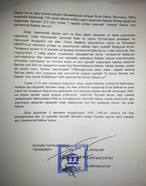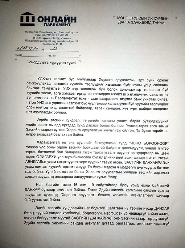Улс орны эдийн засгийн нөхцөл байдал хүндэрсэнтэй холбогдуулан УИХ-ын ээлжит бус чуулган хуралдаж, хөрөнгө оруулалтын эрх зүйн орчныг сайжруулах бодлогийн хүрээнд Хөрөнгө оруулалтын тухай хуулийг батлах гэж байгаа бөгөөд яаран сандран батлах гэж байгаа эл хуулийн төсөл нь олон сөрөг үр дагавартай байгааг онцлон Онлайн парламентийн төлөөлөгчдөөс УИХ-ын дарга болон гишүүдэд сонордуулга хүргүүлж байгааг бүрэн эхээр нь хүргэе.