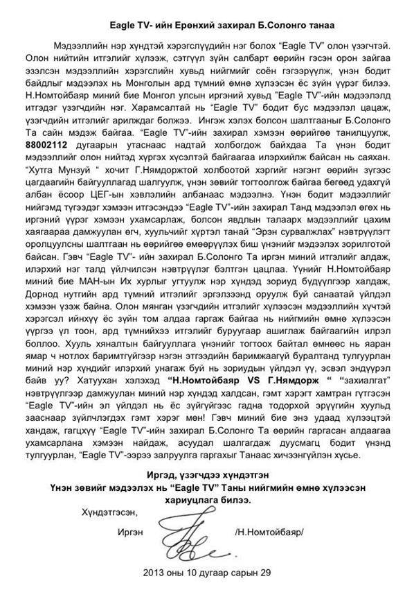 Багагүй хэл аманд орооцолдох болсон УИХ-ын гишүүн Н.Номтойбаяр Eagle телевизийн захиралд хандан захидал илгээжээ. Тэрээр тус телевизээр өөртэй нь холбоотой шуугиан тариад байгаа Мунзуй Нямдорж, бие хамгаалагч Батзориг нарын ярилцлага бүхий нэвтрүүлэг бэлтгэсэнтэй холбоотойгоор дараах захидлыг хүргүүлээд байгаа аж.