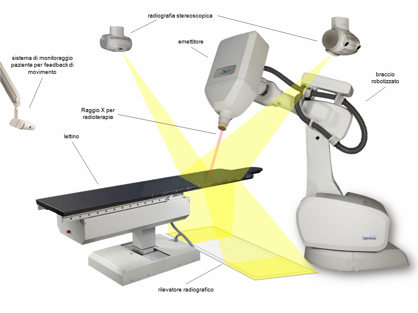 Хорт хавдрын цацраг туяаны эмчилгээний уламжлалт төхөөрөмжийн дутагдалтай талыг сүүлийн үеийн роботын технологийн тусламжтайгаар нөхөж, эмчилгээний үр дүнд зарим ахиц гаргах болсон байна. АНУ-д бүтээгдсэн Сайбер найф хэмээх роботоор эмчилгээ хийхийн өмнө компьютер томографийн 100 гаруй зургаас хорт хавдрын байрлалыг нарийвчлан тодорхойлж, бусад эрүүл эрхтнүүдээс ялгах заагийг тогтоох шаардлагатай. Улмаар хавдрын эргэн тойронд нийт 1200 чиглэлээр цацрагаар шарж, хавдрын эсүүдийг өндөр нарийвчлалтайгаар устгадаг байна. Нэг удаагийн эмчилгээ 30-45 минут үргэжлэх боловч өвчтөнд ямар ч зовиургүй ажээ. Эхний түвшний ийм төрлийн роботын дутагдалтай тал нь уушиг, элэг гэх мэт амьсгалах үеийн цээжний тэлж агших хөдөлгөөнд оролцдог эрхтнүүдийн эмчилгээ хийх боломжгүй байв.