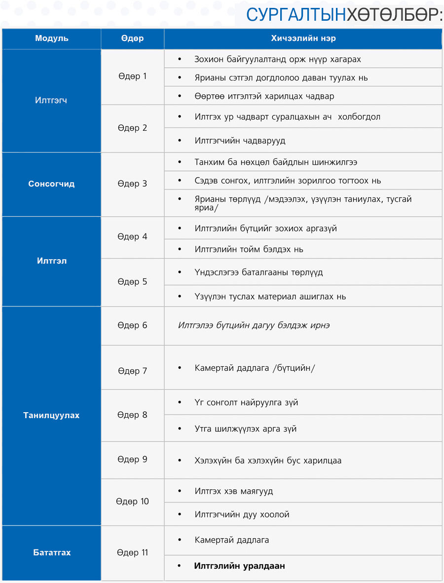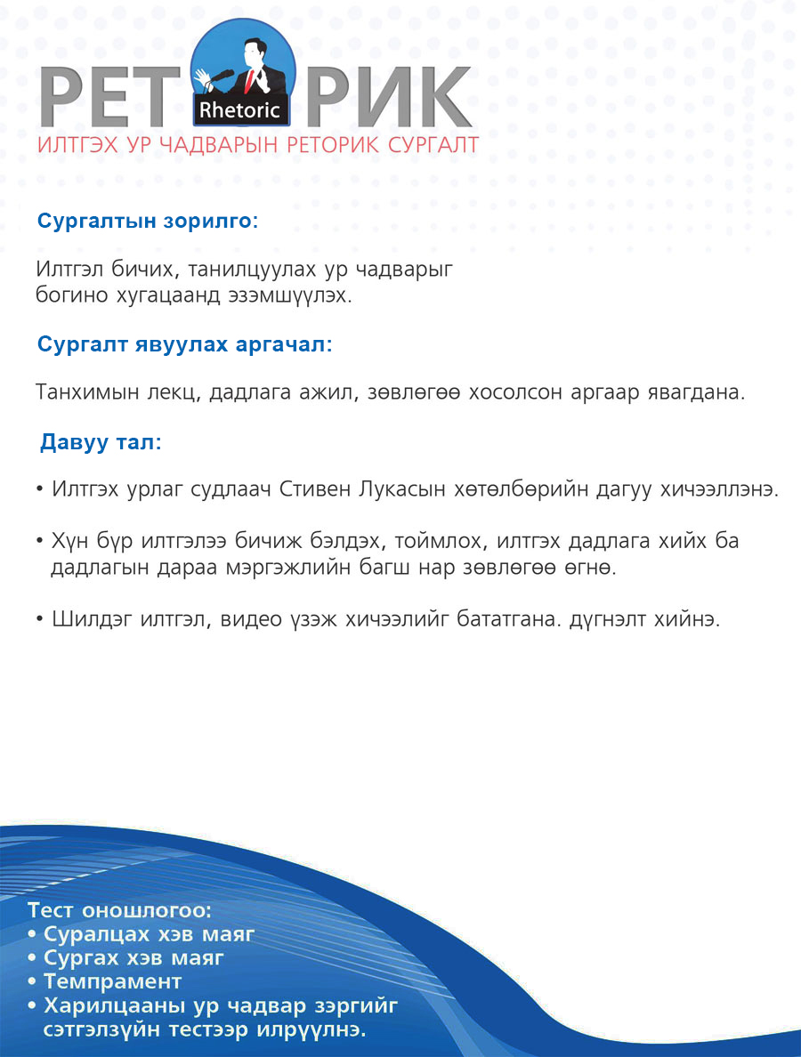 Ажилдаа амжилт гаргах, стрессээ тайлах, эрүүл байх, хүссэндээ хүрэхээс гадна хамгийн чухал зүйл бол өгсөх шатаа өөрөө босгох чадвар юм. Ирээдүйд хүрэхийг хүсэж байгаа өндөрлөгт тань хүргэх хамгийн том хэрэглүүрээ олж эзэмших боломж бидэнд бий. Илтгэх ур чадварын Реторик сургалт 2013 оны 12 сарын 11-ны өдөр эхлэх гэж байгаа тул та бүхнийг хүрэлцэн ирж суралцахыг урьж байна.. Бүртгэлийн тоо хязгаартай.Та бүхэн хуучин оноо үдэхээсээ өмнө амжилтын нэг нууцыг амжиж өөртөө нээхийг хүсэж байвал 70101839,70111839,99049075-аар бүртгүүлэх боломжтой.