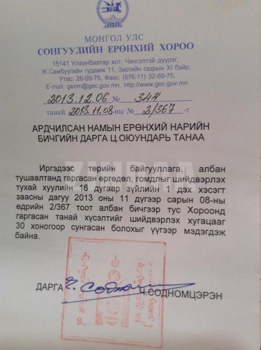 Харин СЕХ-оос хариултаа өчигдөр өгөх ёстой байсан. Тэгвэл СЕХ-ны дарга Ч.Содномцэрэн “Танай хүсэлтийг шийдвэрлэх хугацааг 30 хоногоор сунгав” гэсэн хариуг АН-ын Ерөнхий нарийн бичгийн дарга Ц.Оюундарьд илгээжээ. Увсын хоёр гишүүнийг ажлаас нь чөлөөлөх асуудлаар Увс аймгийн Тариалан сумын малчид, төрийн бус байгууллагууд удаа дараа СЕХ-нд хандсан ч одоог хүртэл асуудлыг шийдвэрлээгүй байгаа юм. Уг асуудлыг СЕХ-ны дарга Ч.Содномцэрэн гацааж байна гэж хардах хүмүүс байгаа юм.