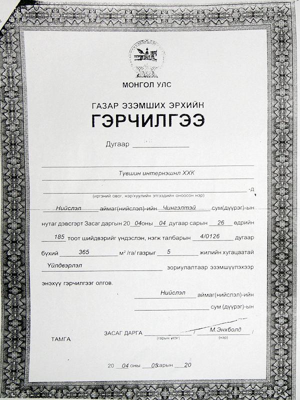 Улмаар Т.Бадамжунайд гаргасан хүсэлтийнх нь хариуг 2004 оны тавдугаар сарын 20-ны өдөр Нийслэлийн Засаг дарга М.Энхболд өгсөн байгааг доорх баримтаас харж болно. Тодруулбал, тэрбээр газар эзэмших эрхийн гэрчилгээг Чингэлтэй дүүргийн Засаг даргын 2004 оны 4 дүгээр сарын 26-ны өдрийн 185 тоот шийдвэрийг үндэслэн, нэгж талбарын 4/0126 дугаар бүхий 365 м2 газрыг 5 жилийн хугацаатай үйлдвэрлэл зориулалтаар эзэмшүүлэхээр энэхүү гэрчилгээг олгов гээд гарын үсгээ зурчихаж. Цаг хугацааны хувьд хоёр жилийн дараа газар эзэмших гэрчилгээг Түвшин-Интернэшнл ХХК авсан харагдаж байгаа юм.