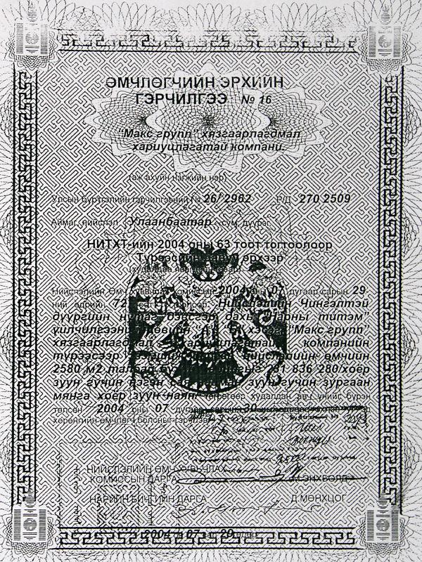 Мөн энд анхаарал татахаар нэг баримт байгаа нь Нийслэлийн Засаг дарга М.Энхболд Түвшин-Интернэшнл ХХК-д газар эзэмших гэрчилгээг өгснөөс хойш хоёр сарын дараа тус газрыг Өмчлөгчийн эрхийн гэрчилгээ Макс группын нэр дээр гарсан байдаг нь дараах баримтаас харагдаж байна.
