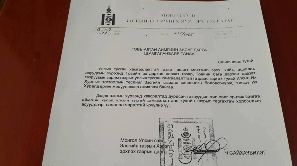 Засгийн газрын хэрэг эрхлэх газрын дарга Ч.Сайханбилэг говийн дархан газруудыг улсын тусгай хамгаалалтаас гаргах тухай албан бичгийг Говь-Алтай аймгийн Засаг дарга Ш.Амгаланбаярт илгээжээ. Албан бичигт “Улсын тусгай хамгаалалттай газарт ашигт малтмал эрэх, хайх, ашиглах асуудлын хүрээнд Говийн их дархан цаазат газар, Говийн бага дархан цаазат газруудын зарим газрыг улсын тусгай хамгаалалтаас гаргах тухай Улсын их хурлын тогтоолын төслийг Засгийн газраас санаачлан боловсруулж, Улсын их хуралд өргөн мэдүүлэхээр ажиллаж байгаа.