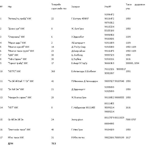Сар шинийн өдрүүдэд Улаанбаатар хот дотор таксийн үйлчилгээнд 17 аж ахуйн нэгжийн 713 такси ажиллаж, дуудлагаар үйлчлэх аж.