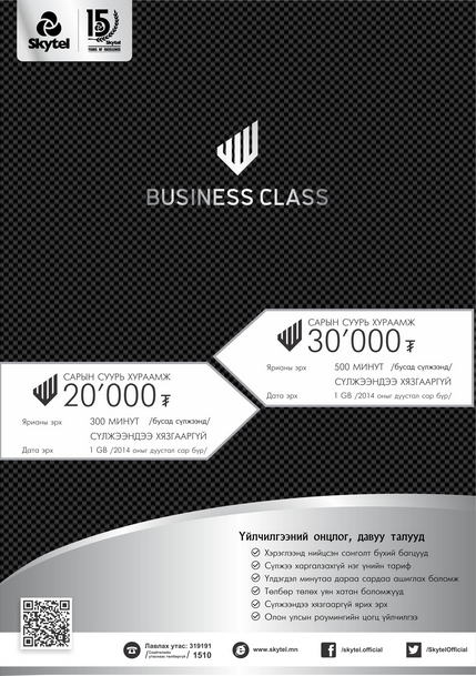 - 2014 оныг дуустал сар бүр 1 GB дата ашиглах боломжтой. Мөн дээрээс нь Монгол орон даяар өндөр хурдны интернэт ашиглах боломжтой “Sky 3G+” үйлчилгээний дата багцуудаас хэрэглээндээ нийцүүлэн ашиглах, 244 орны 700 гаруй операторуудын нэгдсэн GSM сүлжээнд МЕССЭЖ РОУМИНГ болон ОЛОН УЛСЫН РОУМИНГИЙГ ЦОГЦ ҮЙЛЧИЛГЭЭГ ашиглан гадаадад өөрийн гар утсаа ашиглан дуудлага хийх, хүлээн авах, мессэж илгээх болон хүлээн авах, интернэтэд холбогдон цаг үетэйгээ хөл нийлүүлэн алхах боломжтой. Ухаалаг бизнес эрхлэгчдийн нэрийн хуудас “Business Class” үйлчилгээ.