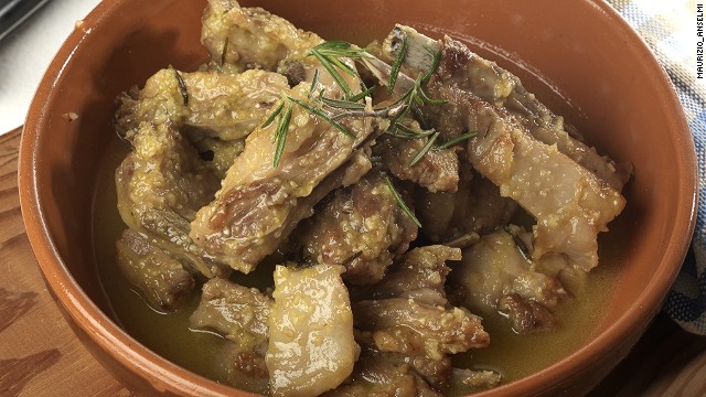 Бяслаг, өндөгтэй хурганы мах. Уулархаг Абруццо нутгаас гаралтай учраас ингэж нэрлэсэн. Өөх тос ихтэй уулын хонины махаар хийдэг хоол. Ялз чанасан хавирга, гол махыг шөлөнд нь уусгасан бяслаг, өндгөөр амталдаг.