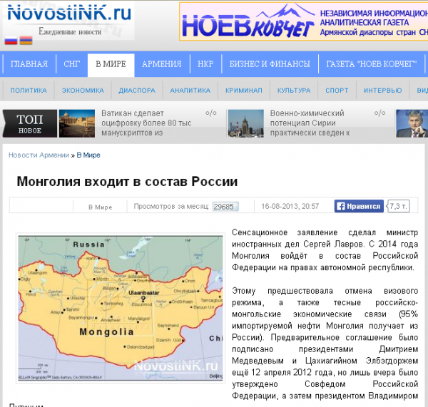 ОХУ-ын Гадаад харилцааны сайд Сергей Лавров нэгэн шуугиантай мэдэгдэл хийсэн талаар Оросын http://novostink.ru сайтад бичжээ. Уг мэдэгдэлд, 2014 онд Монгол Улсын Оросын бие даасан автономит улс болно гэсэн байна.