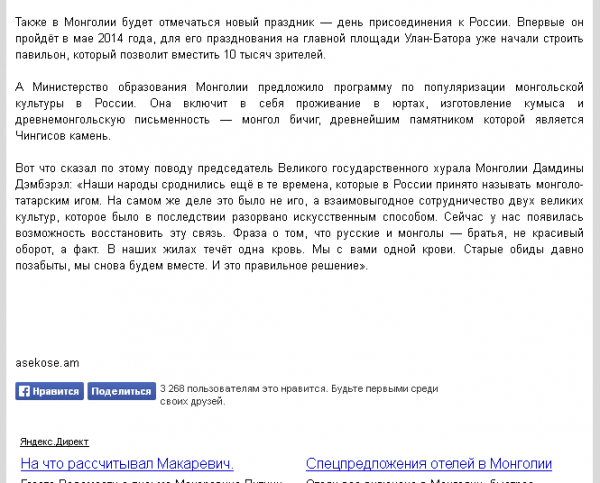 За юу гэж ийм мэдрэл юм байдаг юм. Ойлгомжтой шдээ. Монголын иймэрхүү хов хутгадаг шар сайтуудтай адилхан оросын шару сайт балайрч байхгүй юу. За юу гэж ийм юм байдаг юм. хаа газрын шар хэвлэлүүд солиорч л байдаг шдээ. Монгол бол их үнээр олдсон тусгаар тогтносон улс орос ч монголыг нэгтгэхгүй. тэр ойлгомжтой. монголчууд 16 дахь республик чинь болий гээд өөрсдөө гуйгаад байхад аваагүй улс шүү дээ. гэхдээ жараад оны тэр цаг үе нь монголын удирдагчидад түгшүүр төрүүлсэн, байдал эвгүйтвэл хятадын цэрэг ороод ирчих гээд байсан үе л дээ. харин зөвлөлтийн цэргийн ангиуд монголд олноор орж ирж байрласан тул хятадууд санаархлаа татсан юм. тиймээс барилгын ажилчид гээд 3 дивиз цэрэг улаанбаатар, төв аймагт ороод ирчихсэн комиад өгөхийг хүлээж байсан байдаг. хэрвээ тэр үед зөвлөлтийн цэрэг орж ирээгүй бол түүх өөрөөр бичигдэх ч магадгүй байжээ. ер нь хятад дотроо самуурах л юм бол монголыг авна гэж хийрхдэг улс шд