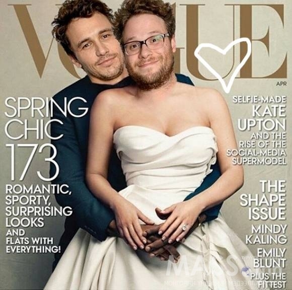 Реалити шоуны од Ким Кардашиан, реппер Кени Вест нар алдарт “Vogue” сэтгүүлийн дөрөвдүгээр сарын нүүрийг чимэхээр болжээ. Харин энэ нүүрийг харсан тус сэтгүүлийн зарим уншигчид эсэргүүцэж буйгаа илэрхийлсэн байна. Тэгвэл удалгүй инээдмийн жүжигчин, продюсер Сет Роген, жүжигчин, найруулагч Жеймс Франко нар тэдний сэтгүүлийн нүүрэн дээр байгаа зурганд өөрсдийгөө орлуулж, элэглэн цахим хуудаснаа байршуулжээ. Тэд фотошопоор эвлүүлэн өөрсдийгөө орлуулсан гэнэ. Хоёр жүжигчин өмнө нь Ким, Кени нарын бүтээсэн “Bound 2” хэмээх клипийг элэглэж байсан бөгөөд энэ нь хоёр дахь тохиолдол боллоо.