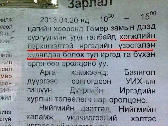 Ийм нэгэн зар фейсбүүкээр тарав. Уг зар дээр "2013.04.20-нд Төмөр замын дээд сургуулийн урд талбайд хөгжлийн бэрхшээлтэй иргэдийн үзэсгэлэн худалдаа болно" гэж бичжээ. Зар бичигч бээр уг нь, хөгжлийн бэрхшээлтэй иргэдэд зориулсан эд зүйлийн үзэсгэлэн болно л гэж бичих гэсэн нь энэ. Дүүргийн ЗДТГ-аас гаргасан зар ажээ. Төрийн албан хаагчид аа гэж.
