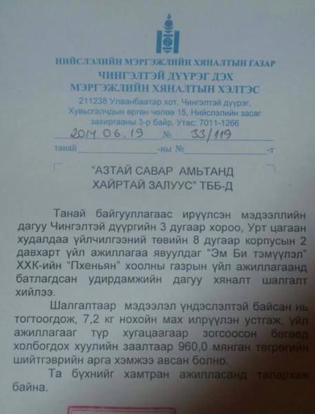 “Азтай савар- Амьтанд хайртай залуус” ТББ-аас нохойн махаар хоол хийдэг хоолны газар байна гэх мэдээллийг Чингэлтэй дүүргийн МХГ-т өгчээ. Уг мэдээллийн дагуу дүүргийн мэргэжлийн хяналтын хэлтсээс Урт цагаан худалдаа үйлчилгээний төвийн наймдугаар корпусын хоёр давхарт үйлчилгээ явуулдаг “Пхеньян” хоолны газарт хяналт шалгалт хийхэд нохойн мах хэрэглэж байсан нь тогтоогджээ.