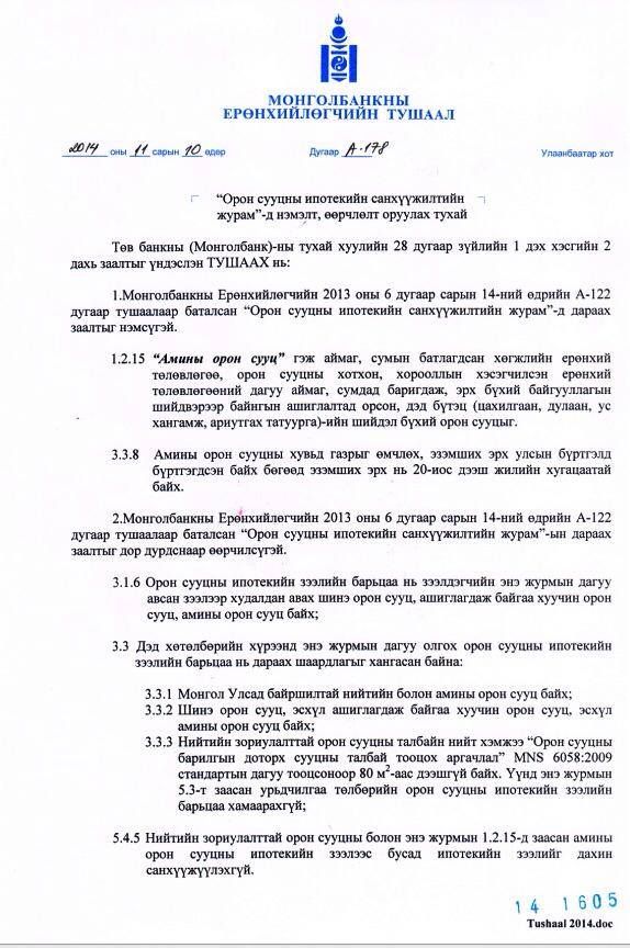 Тэгвэл 11 дүгээр сарын 10-ны өдөр Монголбанкны Ерөнхийлөгч Н.Золжаргал энэ талаар тушаал гаргаж, орон нутагт амины орон сууц барих иргэдэд найман хувийн хүүтэй орон сууцны зээл олгохоор боллоо.