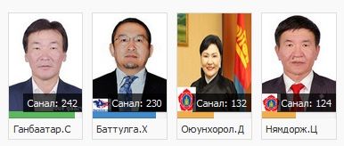 Улс орон, ард иргэддээ хэрэгцээтэй ямар хууль дүрэм санаачлан батлуулж, ямар тогтоол шийдвэр гаргахад хувь нэмэр оруулж байна вэ? Таны сонгосон төрийн түшээ хариуцлагатай байж чадаж байна уу гэдэгт уншигчид, сонгогчид, ард түмэн та бүхэн үнэлэлт дүгнэлт өгөх эрхтэй билээ. Одоогийн байдлаар хамгийн хариуцлагатай улс төрчдийн жагсаалтыг С.Ганбаатар гишүүн 242 саналтайгаар тэргүүлж байгаа бол Х.Баттулга 230, Д.Оюунхорол 132 санал, Ц.Нямдорж 124 саналтай байна. Харин Ж.Энхбаяр 108 , Р.Амаржаргал 101, З.Энхболд 95, Г.Уянга 89, Ж.Батзандан 81, М.Батчимэг 69 санал авч, бусад гишүүдээ хошуучилж байна.