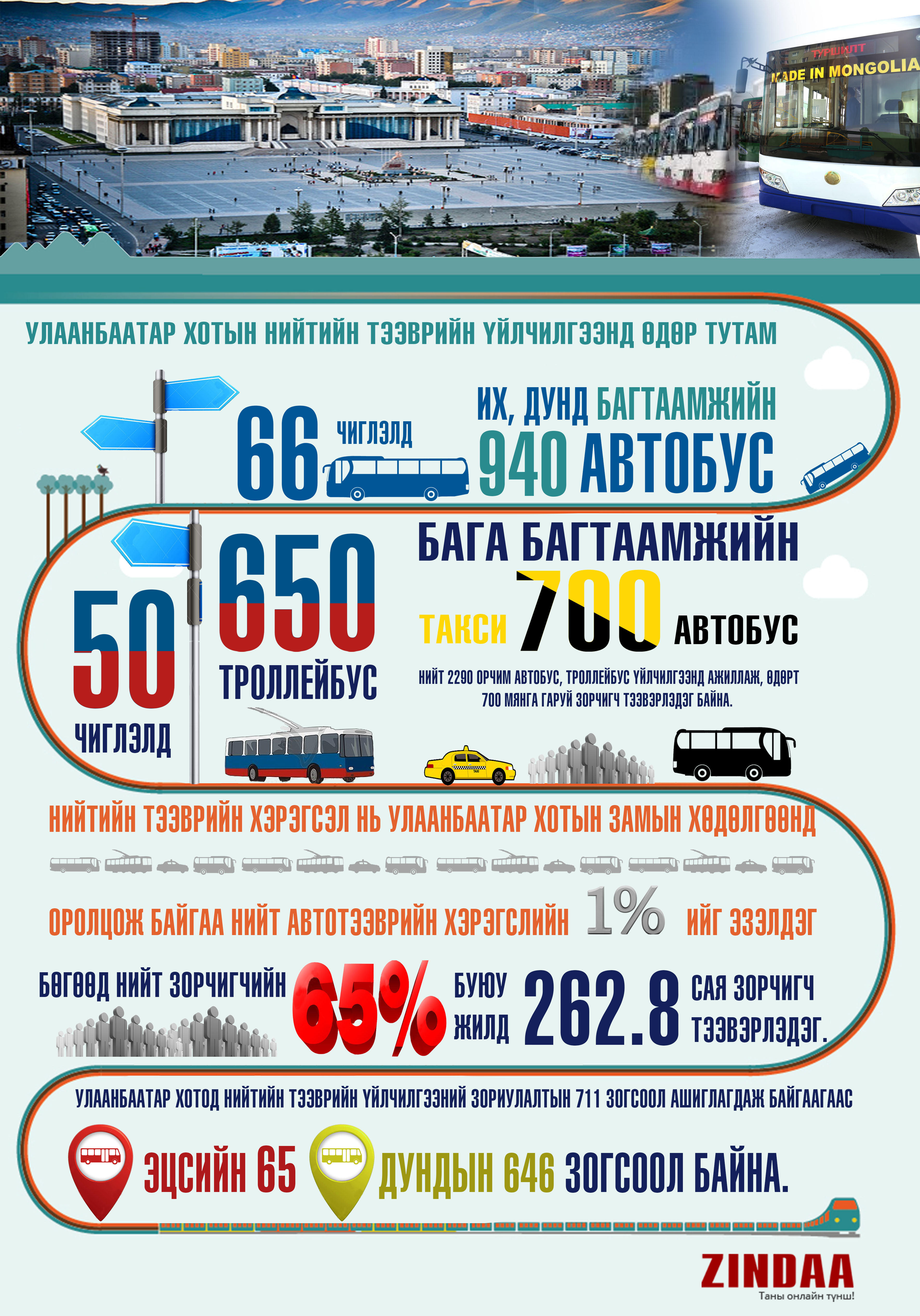 Улаанбаатарчуудын хөл дүүжлэх гол унаа нийтийн тээвэр. Нэг сая гаруй хүн амтай том хотод нийтийн тээврийн хүрэлцээ, тохь тух, маршрут маш чухал. Тэгвэл Улаанбаатарын иргэдийн хэдэн хувь нь нийтийн тээврээр үйлчлүүлдэг болон хэдэн чиглэлд автобус явдгийг тоон мэдээнээс харна уу.