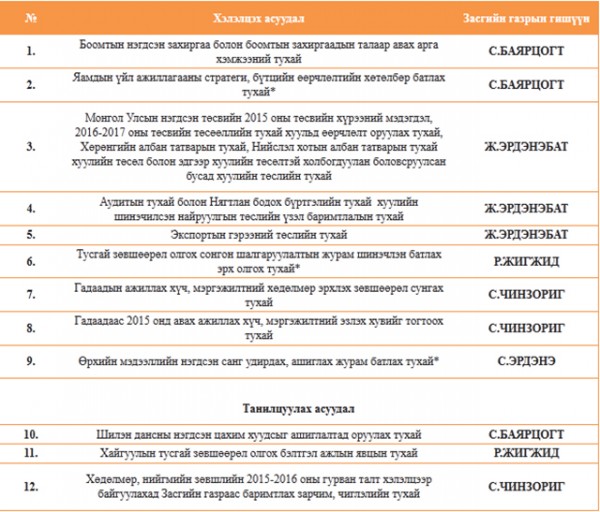 Засгийн газар долоо хоног бүрийн даваа гарагт хуралдах товтой байдаг ч өчигдөр амралтын өдөр байсан тул өнөөдөр хуралдахаар болсон байна. Ерөнхий сайд Ч.Сайханбилэгийн удирдсан Засгийн газрын 2014 оны хамгийн сүүлийн буюу 66 дахь хуралдаанаар дараах асуудлыг хэлэлцэх юм.