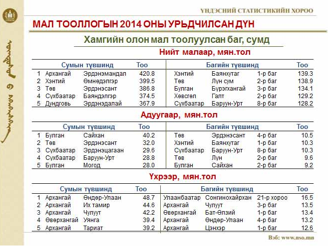 Хамгийн олон мал тоолуулсан эхний 5 аймагт Архангай 4293.9 мянга, Төв 4181.5 мянга, Хөвсгөл 4156.8 мянга, Өвөрхангай 4111.1 мянга, Баянхонгор 3465.9 мянган толгой байна.