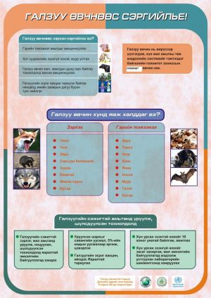 Увс аймгийн малчин Б-ийн хотонд галзуу үнэг орж ирсэн байна. Үнэгийг барьж аймгийн мал эмнэлгийн лабораторид шинжилэхэд галзуу өвчнөөр өвчилсөн нь тогтоогдсон байна. Үнэгийг малчин Б өөрөө өвчсөн учраас түүнд галзуу өвчний эсрэг вакцин, ийлдэс эмчилгээнд хамруулсан аж. Галзуу өвчнөөс сэргийлэхийн тулд дараахи зөвлөмжийг дагаарай.