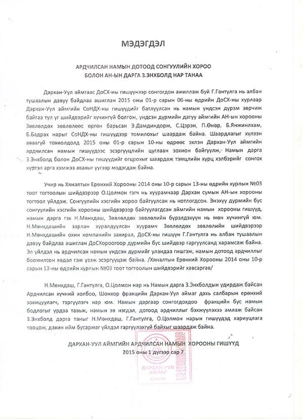 Ардчилсан намын дарга З.Энхболдод Дархан-Уул аймгийн Ардчилсан намын гишүүдээс шаардлага хүргүүлсэн байна. Тэд Дархан-Уул аймгаас Дотоод сонгуулийн хорооны гишүүнээр сонгогдон ажиллаж байгаа Г.Гантулгыг албан тушаалынхаа давуу байдлаа ашиглан дотоод сонгуулийн хорооны хурлаар гишүүдийг батлуулсан. Энэ нь намын дүрэм зөрчиж байна. Иймд намын дарга уг шийдвэрийг хүчингүй болгож намын хорооны зөвлөлдөх зөвлөлөөс өргөн барьсан хүмүүсийг Дотоод хорооны гишүүнээр томилохыг шаардаж байна гэжээ. Мөн тэд энэ сарын 10-ны өдрөөс эхлэн 14 хоногийн хугацаатай нийт 300 орчим хүний бүрэлдэхүүнтэйгээр жагсаал зохион байгуулах аж. Уг жагсаалыг зохион байгуулах бичгээ Сүхбаатар дүүргийн Засаг дарга Д.Бадарсанд албан бичгээр хүргүүлжээ.
