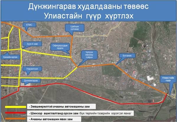Улаанбаатар хотод таван тонноос их жинтэй тээврийн хэрэгслийг шинэ замаар явуулахаар болсон байна. Өөрөөр хэлбэл “Дүнжингарав” худалдааны төвийн баруун урд уулзвараас Улиастайн гүүр хүртэлх 6.6 км автозам ашиглалтад орсонтой холбогдуулан Чулуун-Овооны уулзвараар “Нарантуул” олон улсын худалдааны төв хүртэл Нарны замаар зорчих ачааны автомашины хөдөлгөөнийг бүх жин нь таван тонноос хэтрүүлэхгүй байхаар хязгаарлаад байгаа. Тиймээс таван тонноос их жинтэй ачааны машиныг хойгуураа буюу Чулуун овооны уулзвараас Офицеруудын ордон, Цайз зах, Дарь эхийн замаар, урдуураа “Дүнжингарав” худалдааны төв, Үндэсний цэцэрлэгт хүрээлэн, Гандийн гудамж, Энхтайвны гүүрний тоогуур зам, Дунд голын зам, “Говь” ХХК-ны урд зам, Ажилчны гудамжны замаар зорчуулахаар шийдвэрлэсэн байна.