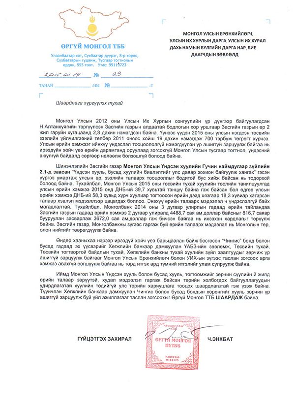 Мөн Хөгжлийн банкаар дамжуулан “Чингис” болон бусад бондын хөрөнгийг хууль зөрчин үр ашиггүй зарцуулж буй үйл ажиллагааг таслан зогсоохыг шаарджээ. Тус шаардлагад "Монгол Улсын 2015 оны төсвийн тухай хуулийн төслийн танилцуулгад өрийн хэмжээ 2015 онд ДНБ-ий 39.7 хувьтай тэнцүү байна гэж тусгасан бол өдгөө улсын өрийн хэмжээ ДНБ-ий 58.3 хувьд хүрч хуулиар тогтоосон өрийн дээд хязгаар 18.3 хувиар хэтэрсэн тухай мэдээлэл цацагдах боллоо. Энэхүү өрийн талаарх мэдээлэл ч үндэслэлгүй байх магадлалтай. Тухайлбал, Монголбанк 2014 оны III улирлын гадаад өрийн тайландаа Засгийн газрын гадаад өрийн хэмжээ II улиралд 4488.7 сая ам.доллар байсныг 816.7 саяар бууруулан засварлаж, 3672.0 сая ам.доллар гэж бичсэн байгаа нь ихээхэн хардлага төрүүлж байна. Засгийн газар, Монголбанкны өрийн талаарх мэдээлэл нь төр, олон нийтийг төөрөгдүүлж байна" хэмээсэн байна.