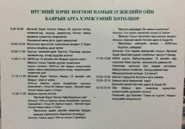 Иргэний зориг ногоон намын 15 жилийн ойн арга хэмжээ өнөөдөр 09:30 цагаас Драмын эрдмийн театрт эхэлнэ. Энэ хүрээнд Монголын ардчилсан хувьсгалын анхдагч С.Зориг агсны хөшөөнд 10.00 цагаас цэцэг өргөх юм байна.
