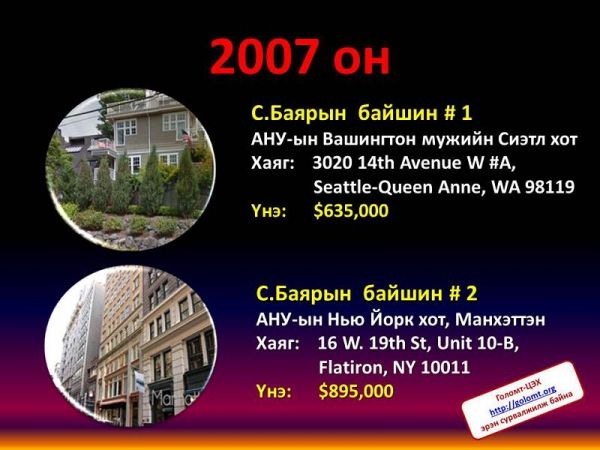 С.Баяр АНУ-д анхны эхнэр болон охидуудынхаа нэр дээр өндөр зэрэглэлийн долоон орон сууц худалдан авсан ба түүнийгээ хэсэг хугацааны дарааа эргүүлэн заржээ. Мөн Ерөнхий сайд асанг бэлэглэлийн гэрээний дагуу орон сууц бэлэглэж хууль бус мөнгө угаасан хэмээн үзэж байгаа юм байна.