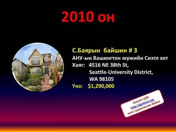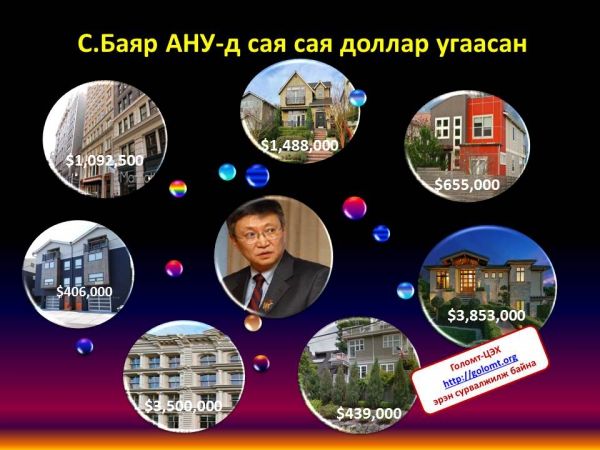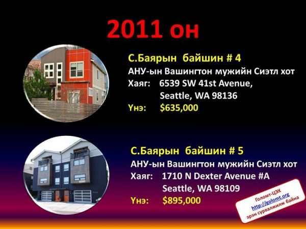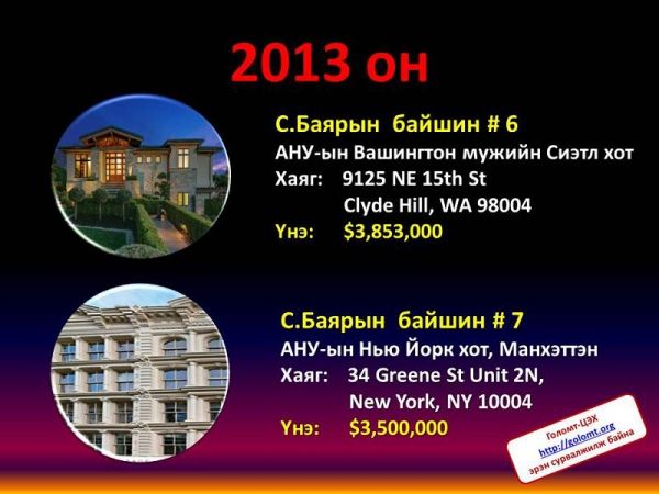 Өнөөдөр УИХ-ын гишүүн Г.Уянга Ерөнхий сайд асан С.Баярын АНУ-д худалдаж авсан орон сууцнуудын талаар ноцтой мэдээллийг олон нийтэд ил болгож хэвлэлийн хурал хийлээ. Тус мэдээллийг golomt.org сайтаас УИХ-ын гишүүн Г.Уянгад ирүүлсэн байна. Тэрээр “энэ мэдээллийг олон нийтэд ил болгоосой гэж надад явуулсан байх. Надаас өөр улс төр судлаач н.Ганхуяг зэрэг олон хүнд энэ мэдээллийг явуулсан байна. Энэ мэдээлэл Оюутолгойн гэрээтэй холбоотой байж болзошгүй гэж үзэж байгаа учраас олон нийтэд мэдээллээ” гэсэн юм.