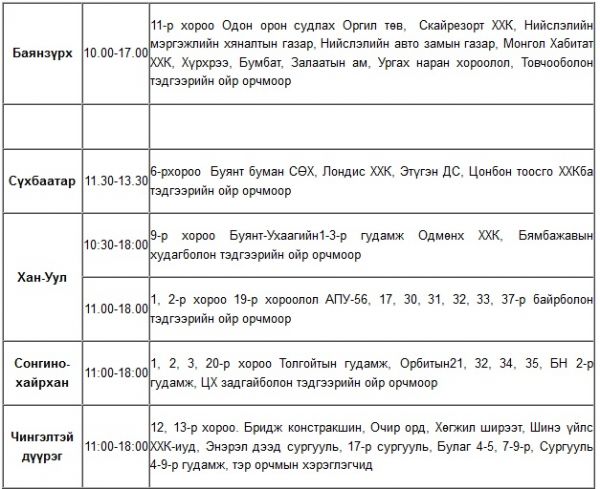 Нийслэлийн хэмжээнд цахилгаан шугам тоноглолд засвар үйлчилгээ хийж байгаатай холбогдуулан өнөөдөр дараахь байршлуудад цахилгаан хязгаарлана.