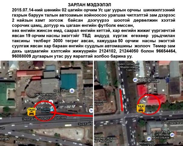 Үндэсний их баяр наадмын үеэр буюу энэ сарын 14-нд “Үндэсний соёл амралтын хүрээлэнд ажилладаг 19 настай охин ажлаасаа эргэж ирэлгүйгээр амиа алдсан харамсалтай хэрэг гарсан. Тодруулбал, охиныг алга болсоноос дөрөв хоногийн дараа буюу өнгөрсөн долдугаар сарын 17-ны өдөр галт тэргэнд дайруулан амиа алдсан байдалтайгаар цогцсыг нь моргоос олсон юм. Охины ар гэрийнхэн нь охиноо амиа хорлосон бус гадны нөлөөтэй нас барсан гэж үзэн хуулийн байгууллагаар шалгуулж байгаа. Тиймээс цагдаагийн байгууллагаас мөрдөн байцаалтын ажиллагаа явуулж, байцаалтын явцад охины хамгийн сүүлд суусан таксины жолоочийг хайж эхэлсэн ч өнөөдрийг хүртэл олоогүй байна. Энэ нь хэргийн мөрдөн байцаалт удаашралтай явагдах шалтгаан болж байгаа юм. Иймээс охины сууж явсан машиныг харсан үзсэн хүн байвал цагдаагийн байгууллагад хандахыг цагдаагийн байгууллагаас хүсч байна.