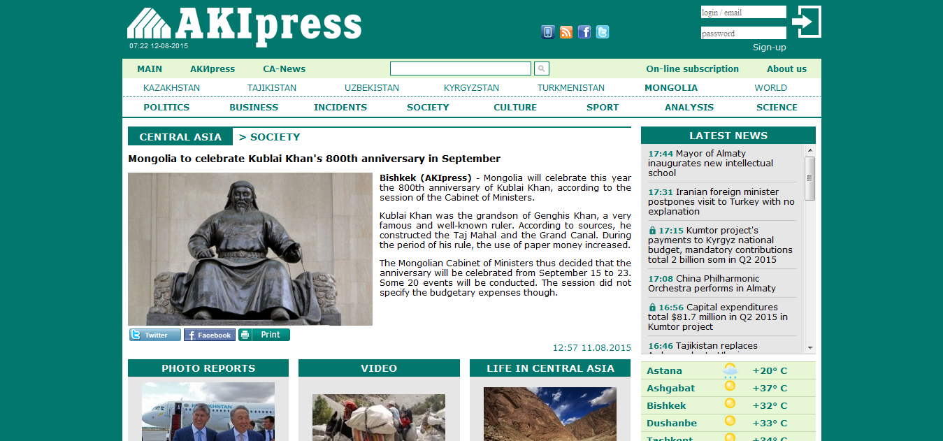 Киргиз, Орос, Англи хэлээр мэдээллээ түгээдэг энэхүү нэр хүндтэй онлайн сайтад өчигдөр “Монгол Улс Хубилай хааны мэндэлсний 800 жилийн ойг тэмдэглэнэ. Сайд нарын танхимын хуралданаар ийм шийдвэр гаргасан. Чингис хааны ач хүү Хубилай хаан маш алдартай, олонд танигдсан удирдагч байсан хэмээгээд эх сурвалжуудад дурдсанаар Хубилай хаан Таж Махал, Гранд Каналыг байгуулсан. Түүний хаанчлалын үед цаасан мөнгө ашиглах нь ихэссэн” хэмээв.