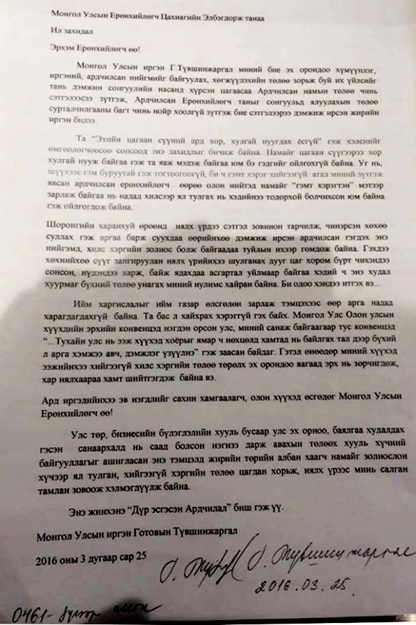 УИХ-ын гишүүн Х.Баттулгын туслахаар ажиллаж байсан гэх Г.Түвшинжаргалыг ШШГЕГ-ын харьяа хорих 461 дүгээр ангид саатуулсан байгаа. Тэгвэл тэрбээр энэ сарын 25-нд Монгол Улсын Ерөнхийлөгчид хандан өргөдөл гаргасан байна. Гэхдээ ШШГЕГ-ынхан цагдан хорих ангиас гар бичмэл гаргахгүй гэсэн учраас өмгөөлөгчөөрөө бичүүлж, өөрөө гарын үсгээ зурсан байна. Ингээд түүний гаргасан өргөдлийг бүрэн эхээр нь хүргэе.