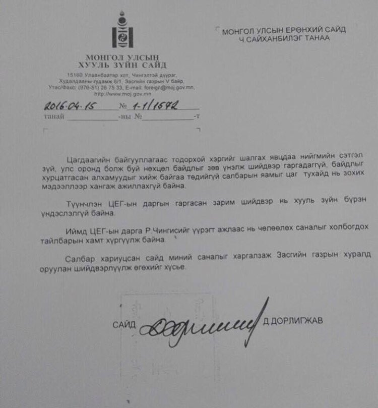 Хууль зүйн сайд Д.Дорлигжав ЦЕГ-ын даргыг өөрчлөх хүсэлт хүргүүлсэн тухай мэдээлэл өчигдөр цахим хэвлэлүүдээр цацагдсан. Энэ мэдээллийг Засгийн газрын Хэвлэл мэдээллийн албанаас үгүйсгэсэн ч Д.Дорлигжав сайд “Ийгл ньюс” телевизэд тайлбар өгчээ.