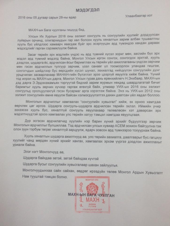 Хуучин бууны хугархайнуудыг МАХН, АН бусад намуудынх мөн адил сонгох гээд хэрэггүй ээ тэд нараас ямар ч шинэлэг санаа гарахгүй эх орноо ч хайрлаад ард түмнийхээ төлөө ажиллах тийм зориг зүрх гарахгүй яг л хуучин бахь байдгаараа л өөрсдийн намынхаа бодлого, хувийн хөрөнгө мөнгө, сандал суудлын төлөө л ажиллах болно тийм болхоор шинэ залуу боловсон хүчинг ямар нэгэн хөрөнгө мөнгөний шуналд автаагүй хувьдаа эзэмшил компангүй, гадаад опшер данс эзэмшдэггүй, байгаль эх ороноо хайрладаг, Монголын ард түмний төлөө тэмцэх зүрх зоригтой тийм залуу боловсон хүчинг гаргах хэрэгтэй сонголтоо зөв хийцгээе
