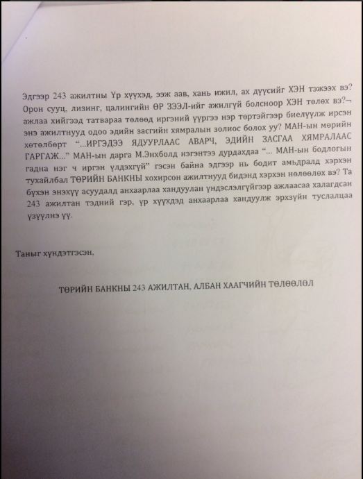 Тодруулбал тус банк 243 ажилтнаа цомхтгохоор мэдэгдэх хуудас хүргүүлжээ. Эдгээр нь бүгд мэргэжилтнүүд бөгөөд гэнэт цомхтголд орохоор болсон нь "зээлгүй хүнгүй" өнөө үед хүнд тусч буй нь ойлгомжтой юм. Ямартай ч тэд нэгдсэн байр сууриа тун удахгүй илэрхийлэх бөгөөд эрх зүйн туслалцаа хүсчээ.