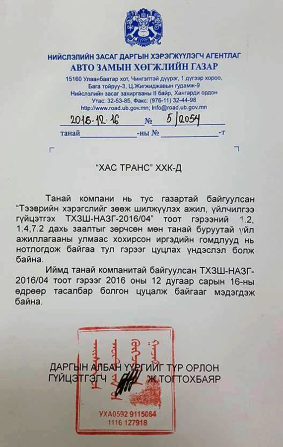 Авто замын хөгжлийн газраас “Хас Транс” ХХК-д гэрээгээ цуцалсан тухай мэдэгдэл хүргүүлсэн байна. Мэдэгдэлд “Танай компани нь тус газартай байгуулсан “Тээврийн хэрэгслийг зөөж шилжүүлэх ажил, үйлчилгээ гүйцэтгэх гэрээ”-ний 1.2, 1.4, 7.2 дахь заалтыг зөрчсөн, мөн танай талын буруутай үйл ажиллагааны улмаас хохирсон иргэдийн гомдлууд нь нотлогдож байгаа тул гэрээг цуцлах үндэслэл болж байна. Иймд танай компанитай байгуулсан гэрээг 2016 оны 12 дугаар сарын 16-ны өдрөөр тасалбар болгон цуцалж байгааг мэдэгдэж байна” гэсэн байна гэж Нийслэлийн ЗДТГ-ын Хэвлэл мэдээлэл, олон нийттэй харилцах хэлтсээс мэдээллээ.