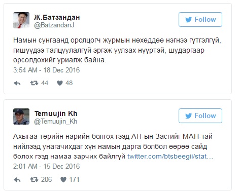 Тэгвэл дээрх жиргээнд УИХ-ын гишүүн Ж.Батзандан ийн хариу бичжээ. Тэрбээр “Намын сунгаанд оролцогч журмын нөхөддөө нэгнээ гүтгэлгүй, гишүүдээ талцуулалгүй эргэж уулзах нүүртэй, шударгаар өрсөлдөхийг уриалж байна” гэжээ.