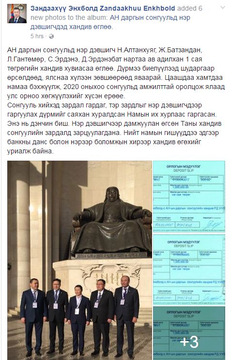Харин тэд нэрлэгдсэн мөнгийг хандиваар бүрдүүлэхээр болоод байгаа. Тэгвэл нэр дэвшигчдээ дэмжих ажлыг АН-ын өнөөгийн дарга З.Энхболд эхлүүлж тус бүрт нь нэг сая төгрөг хандивлажээ. Түүнчлэн шударгаар өрсөлдөн, цаашдаа хамтдаа намаа бэхжүүлж, 2020 оныхоо сонгуульд ялалт байгуулан, улс орноо хөгжүүлэхийг ерөөж буйгаа өөрийн сошиал хуудсаараа илэрхийллээ.