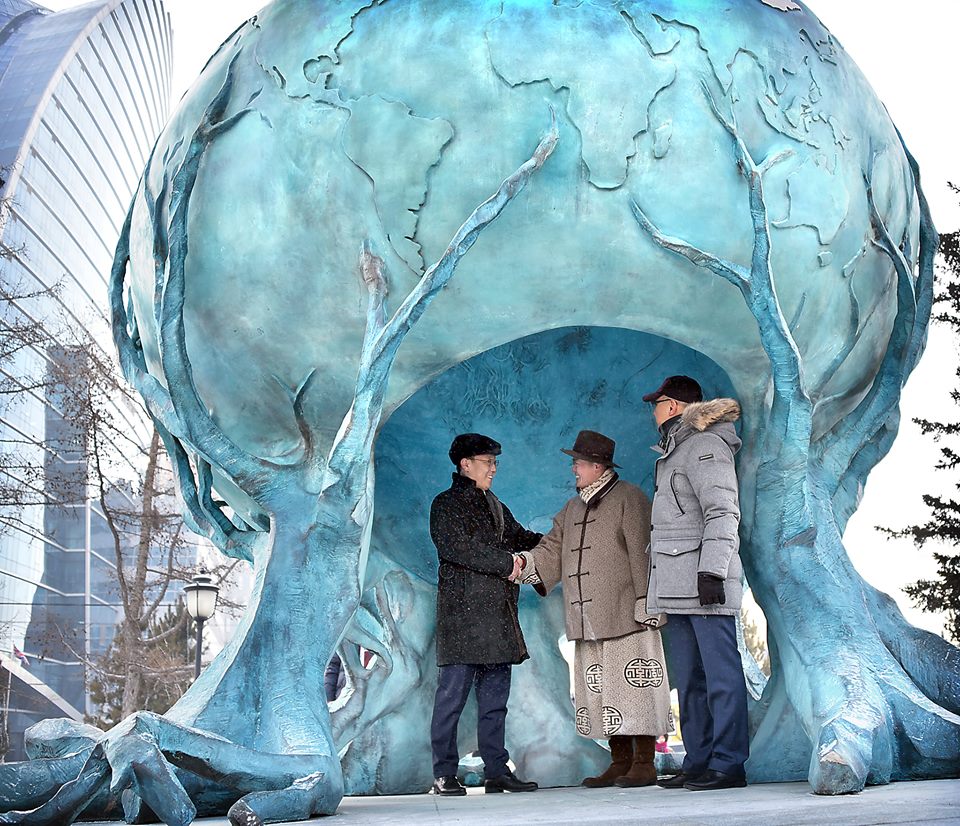 Энэхүү уран бүтээлийг Урчуудын эвлэлийн гишүүн зураач Адъяабазарын Чадраабал бүтээсэн байна. Тэрээр Энэхүү бүтээлдээ таван тивийн олон үндэстэн эх дэлхийгээ хайрлан хамгаалах, хүн төрлөхтний шинжлэх ухааны нээлт ололт, оюун санааны эв хамтын ажиллагааны харилцаа холбоог илтгэж, нүүдэлчин монголчуудын өнө эртний түүх соёл урлагийн өвөөс дүрслэх урлагийн хэлээр мөнхжүүлэн үлдээжээ.