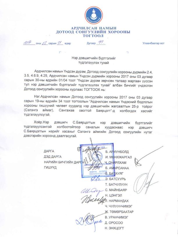 Ардчилсан намын Үндсэн бодлогын хорооны гишүүний чөлөөт суудалд Сэлэнгэ аймагт нэр дэвшсэн Сангажавын Баярцогтыг нэр дэвшигчийн бүртгэлийг түдгэлзүүлсэн байна.