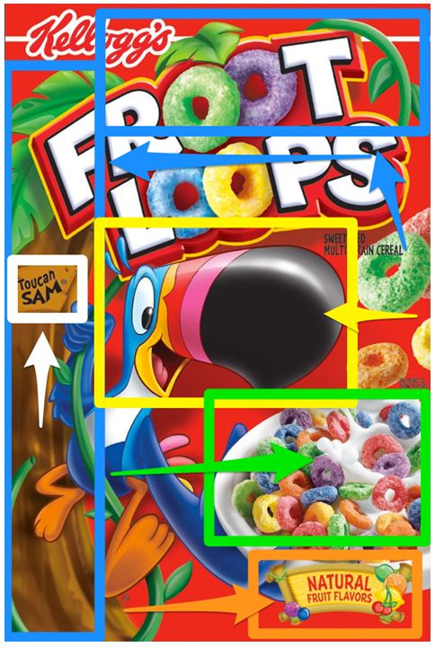 Бюрнетт энэ давуу талыг ажиглаж өөрсдийн бүтээгдэхүүний савлагааг тэр чигт нь зүйрлэл болгожээ. “Froot Loops”-ийн анхны болон дараагийн загварын ялгааг хараарай. Цагаан дэвсгэр дээр “Froot Loops” хэмээн бичсэн савлагаанаас илүү үзэсгэлэнтэй, хөгжилтэй, жаргалтай, амттай гэсэн бүхнийг илтгэх шинэ загвар таны сэтгэлийг хөдөлгөх нь дамжиггүй.