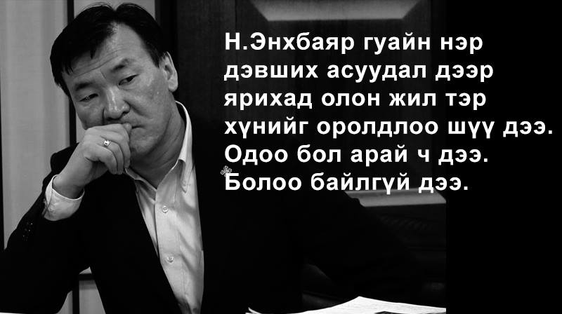 Хуулийн энэ гаргалгаан дээр ажиллаж байгаа хуульчид байгаа байх. МАХН-аас нэр дэвшсэн хүн ялалт байгуулж байж Монгол Улсаа аварна гэж би хатуу итгэж байгаа. Н.Энхбаяр гуайн нэр дэвших асуудал дээр ярихад олон жил тэр хүнийг оролдлоо шүү дээ. Одоо бол арай ч дээ. Болоо байлгүй дээ.
